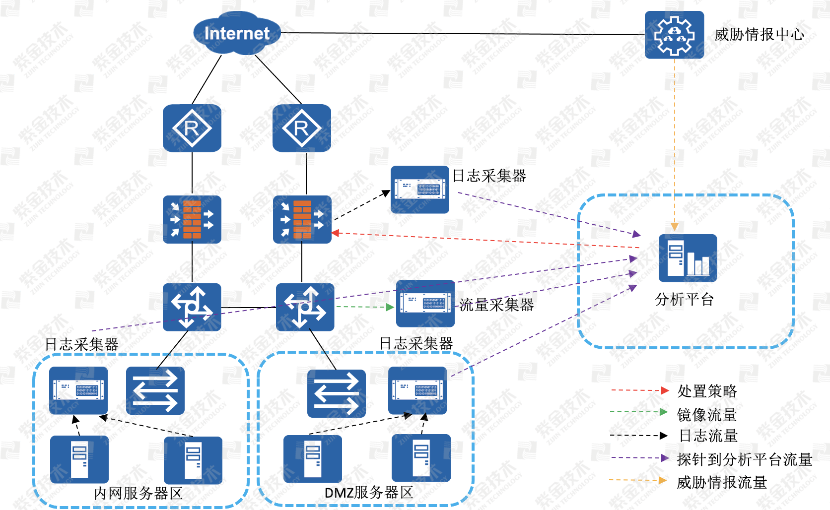 安全威胁解决方案中的各个组件平台(日志采集器、流量采集器、分析平台)均采取旁路部署的模式,组成一个独立的网络,不会和用户本身的网络产生交集,分析平台通过对本地的设备日志、流量日志、本地的安全规则以及威胁情报进行深入、智能、持续地关联与分析,并监控一切可能用于APT攻击的文件,识别各类已知、未知新型网络威胁,并通过与安全设备的联动实现精准的在线阻断防御。从而有效避免APT攻击对企业核心信息资产的威胁,帮助用户全面、直观掌握网络安全风险状况。